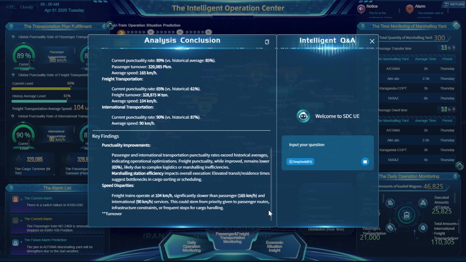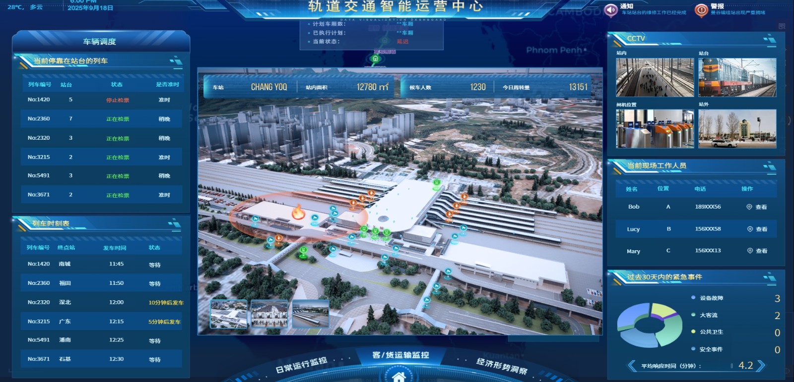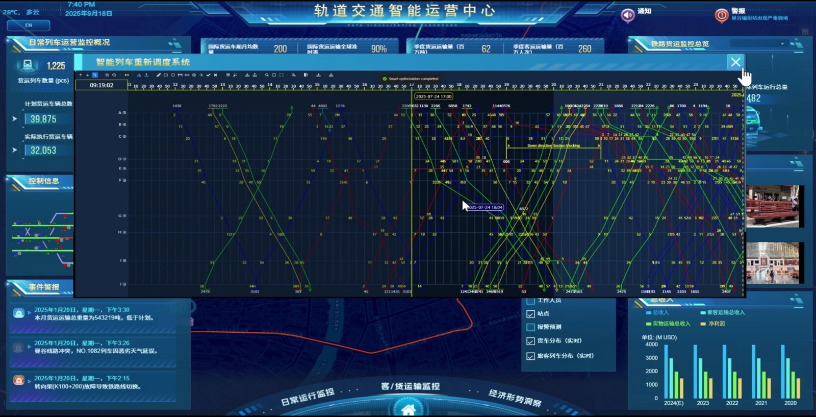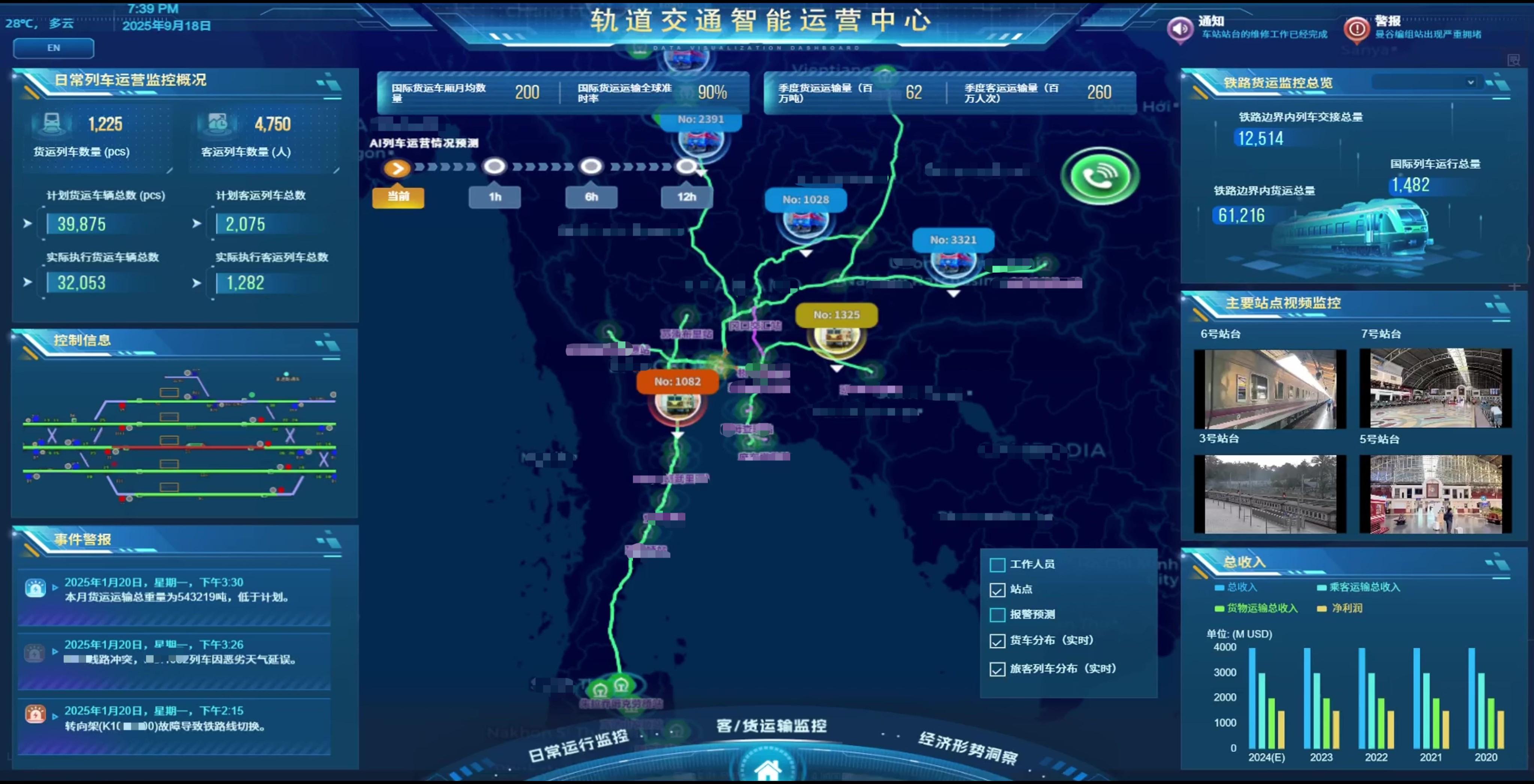 一屏统览客运与货运的整体运营情况,包括准点率、客流量、货运量、在线列车状态等指标,支撑运营指挥与资源优化,提升整体运输效率。