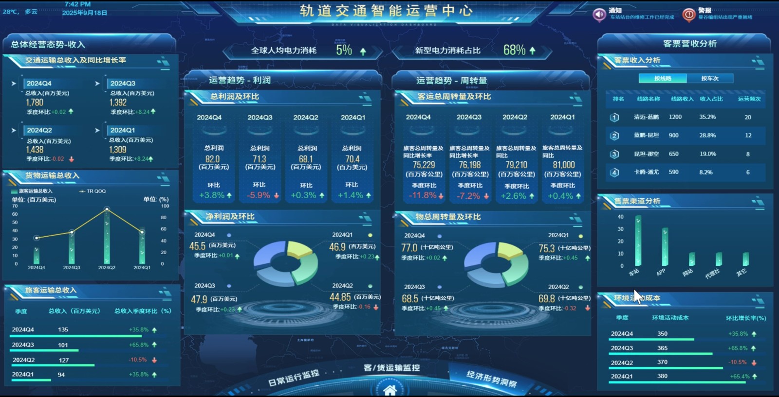 一屏统览客运与货运的整体运营情况,包括准点率、客流量、货运量、在线列车状态等指标,支撑运营指挥与资源优化,提升整体运输效率。
